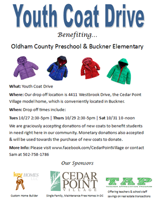 Cedar Point Village is proud to partner with Oldham County Preschool and Buckner Elementary to sponsor a Youth Coat Drive.